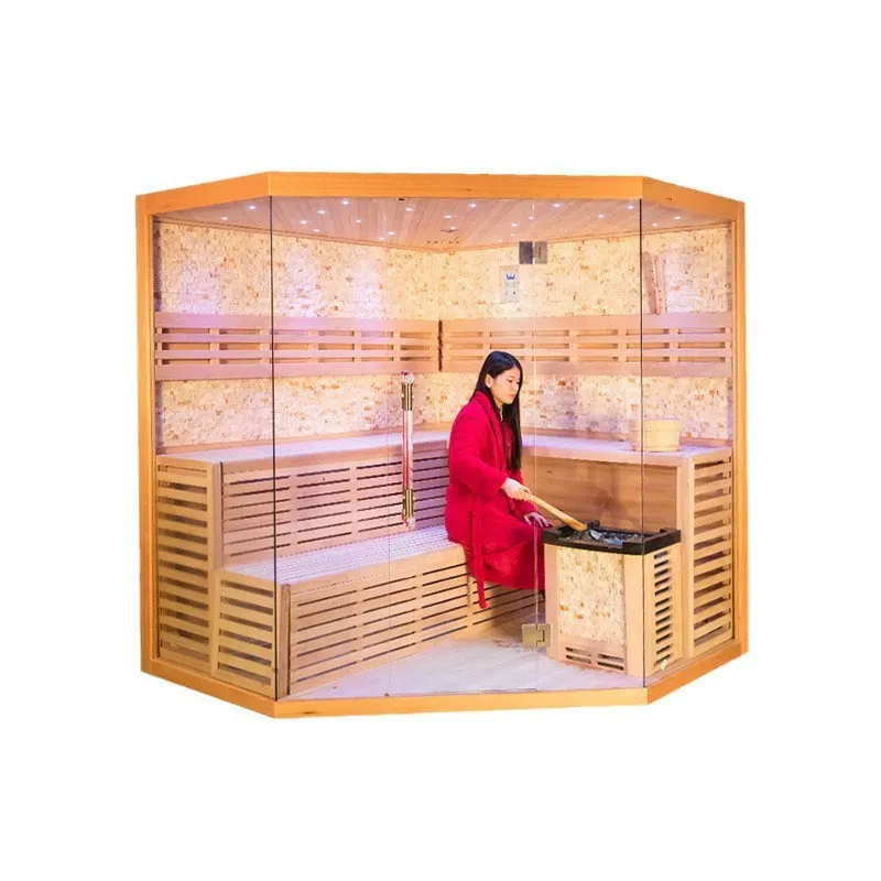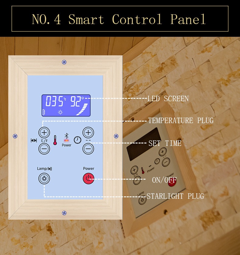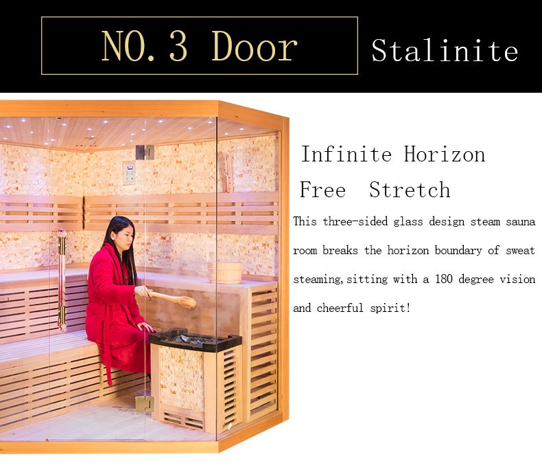 Inovatyvus trijų pusių stalinito stiklo durų konstrukcija, šis stiklas yra specialiai apdorojamas aukštoje temperatūroje, todėl užtikrina puikų atsparumą karščiui ir atsparumą smūgiams. Jis išlaiko stabilumą net esant aukštesnei nei 70 ℃ temperatūrai saunos viduje, pasižymi itin dideliu skaidrumu ir be optinių iškraipymų. Tripusis stiklo dizainas užtikrina 180 laipsnių neuždengtą platų vaizdą, visiškai sulaužydamas tradicinių pirčių ankštą ir uždarą pojūtį. Naudotojai gali palaikyti vizualinį kontaktą su išorine aplinka mėgaudamiesi pirtimi, todėl ji idealiai tinka namų balkonams, kiemams ir kitiems scenarijams – tai leidžia įvertinti lauko peizažą ir kartu patirti šilumos terapiją, kad protas ir kūnas būtų labiau atsipalaidavę ir patogūs. Be to, viduje integruota žvaigždžių šviesos atmosferos sistema sukuria mirksinčios žvaigždės efektą per paslėptas LED šviesos juosteles viršutinėse ir šoninėse sienose. Minkšta šviesa papildo šiltus garus, efektyviai pašalina akių nuovargį ir skatina svaiginančią bei malonią pirties atmosferą.