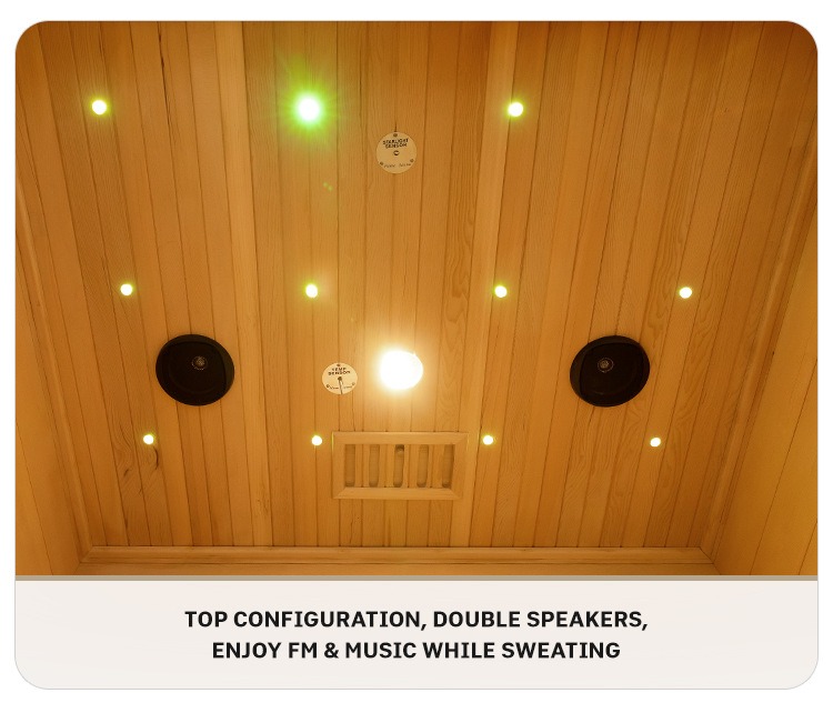 Viršuje sukonfigūruota dviejų garsiakalbių sistema, palaikanti FM radiją ir muzikos atkūrimą. Galite mėgautis savo mėgstamomis melodijomis ar radijo programomis liedami prakaitą, o tai patobulins įtraukiančią pirties patirtį.
