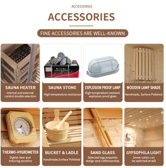 TheStiklinės lauko durys lauko garinėyra aprūpintas 8 pagrindinių priedų kategorijomis, atitinkančiais visus pirties proceso poreikius, detaliai parodančius kokybę: