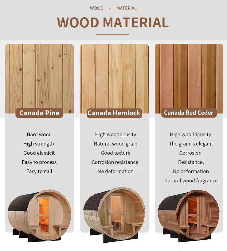 Medienos pritaikymas: Parenkama aukštos kokybės iš Kanados importuota lauko sąlygomis naudojama mediena - pušis (didelio kietumo, ekonomiška, apdorota nuo korozijos), hemlock (didelio tankio, atspari drėgmei ir atspari deformacijoms) ir vakarietiško raudonojo kedro (natūraliai antikorozinė, su natūralaus medžio kvapu, stipriu lauko patvarumu), atitinkanti atsparumo oro sąlygoms įvairiose aplinkose.Stiklinės lauko durys lauko garinė.